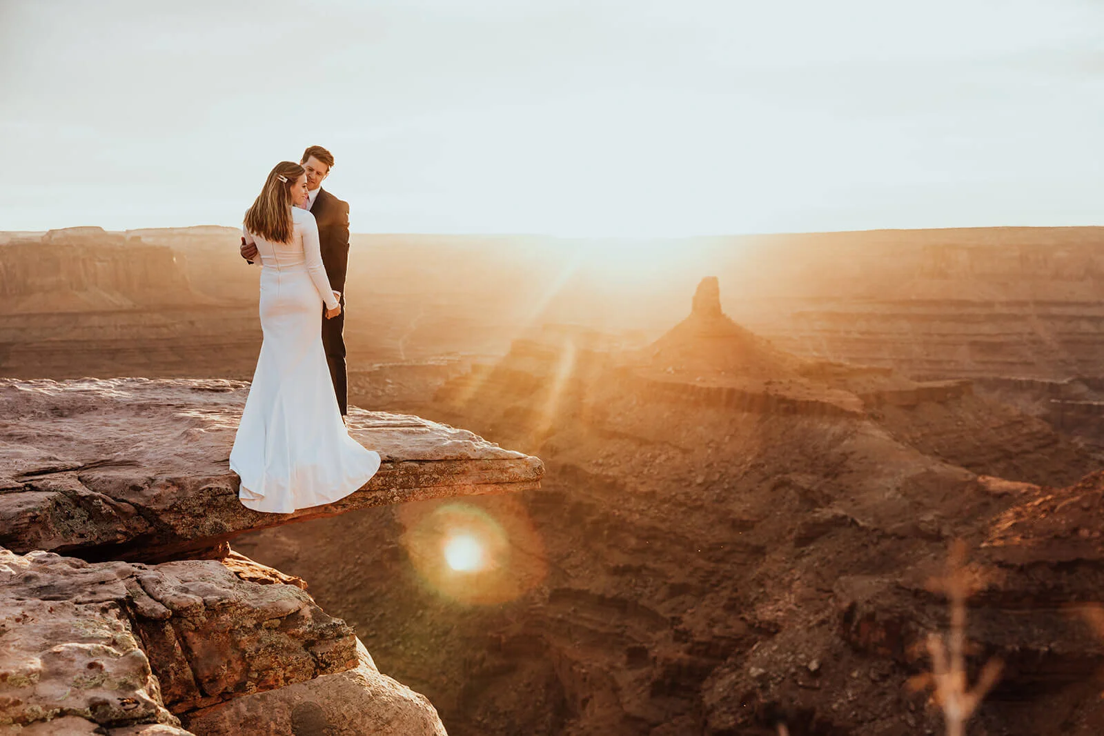 On the other side you look down to see the classic Dead Horse Point view. We hike along the rim for a while, and it’s truly best to take in this view from absolutely every possible direction. As the sun sank a little lower, Janessa changed into her wedding gown, and Brandon into his suit. It was the first time they’d seen each other in their wedding clothes since their wedding, and they were so cute when they saw one another again. We moved to a different section of the park and Brandon in particular had no problem standing close to the edge of some overhanging cliffs.